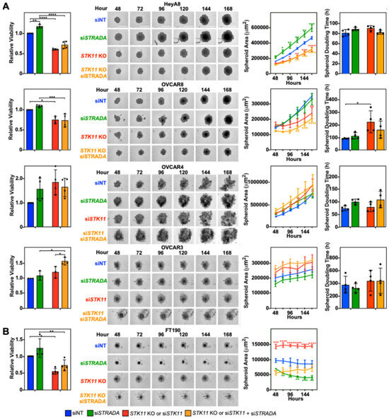 Given the variability observed between EOC cell lines, we next investigated the roles of LKB1 and STRADα on EOC spheroid migration and invasion, as spheroids more accurately recapitulate EOC pathobiology. We first examined the impact of downregulating LKB1 and STRADα on spheroid cell growth and viability, processes which are essential for spheroid-mediated metastasis [28]. We observed that the loss of LKB1 decreased HeyA8 and OVCAR8 spheroid area and viability, whereas STRADα knockdown increased HeyA8 spheroid area and viability. Although no differences were observed in OVCAR3 and OVCAR4 spheroid areas, the downregulation of both proteins increased OVCAR3 spheroid viability (Figure 1A). Since LKB1 reduced the proliferation of cells cultured in monolayer (Supplemental Figure S3C), we next measured spheroid doubling time and observed a significant increase in OVCAR8 spheroid doubling time (Figure 1A). Therefore, in well-established EOC cell lines, it appears that spheroid viability is linked to LKB1 and/or STRADα activity in a diverse manner, with some lines showing a clear loss of growth and others being unaffected. As a noncancerous cell line, we did not expect FT190 cells to form robust spheroids. Indeed, the few FT190 spheroids that formed did not grow in suspension, leading to a discrepancy between the spheroid area and viability (Figure 1B). For this reason, spheroid doubling time could not be quantified and the use of FT190 cells in subsequent spheroid experiments was not pursued.