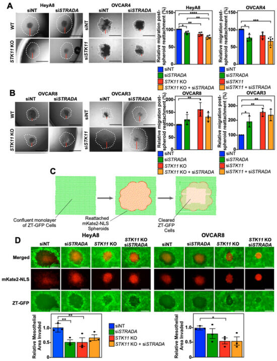 We next investigated whether human EOC spheroid reattachment, an essential step in the spheroid-mediated metastatic process, relies on the LKB1-STRADα pathway. The downregulation of LKB1 and STRADα decreased cell dispersion in the reattached HeyA8 and OVCAR4 spheroids (Figure 2A). Alternatively, downregulating LKB1 and STRADα protein levels increased the cell dispersion of reattached OVCAR8 and OVCAR3 spheroids (Figure 2B). Therefore, it appears that spheroid reattachment is linked to LKB1 and/or STRADα activity in a diverse manner, with some lines showing a clear reduction or increase in reattachment and dispersion on tissue-culture-treated plates.