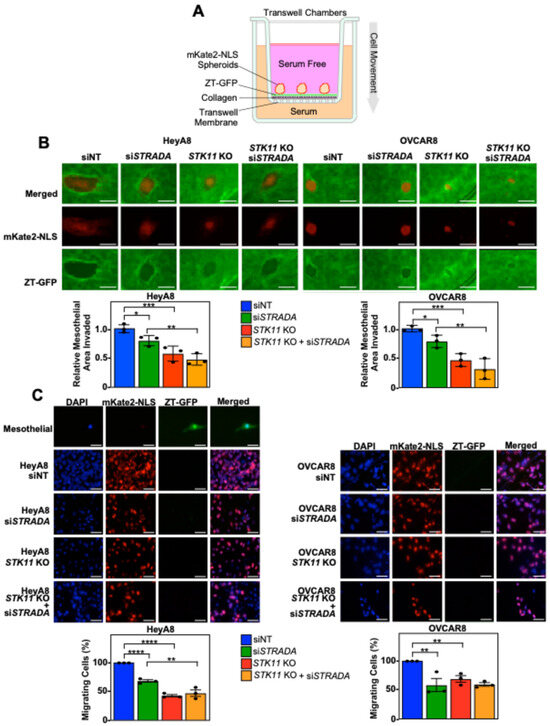 Next, we modeled EOC invasion across the peritoneal lining by reattaching mKate2-NLS-expressing EOC spheroids to a confluent monolayer of ZT-GFP cells on a Transwell membrane coated with rat-tail collagen. Prior to reaching the bottom Transwell chamber, spheroid cells cleared the mesothelial layer and invaded through the pores of a collagen-coated Transwell membrane towards the serum-containing media (Figure 3A). We observed that both STK11 KO and STRADA knockdown decreased mesothelial clearance in both cell lines (Figure 3B). Few ZT-GFP mesothelial cells invaded the Transwell membrane, whereas the number of HeyA8 and OVCAR8 cells was significantly decreased by downregulating LKB1 and STRADα (Figure 3C). Therefore, LKB1-STRADα signalling pathways are essential for EOC spheroids to disperse the mesothelial lining and invade underlying matrix proteins.