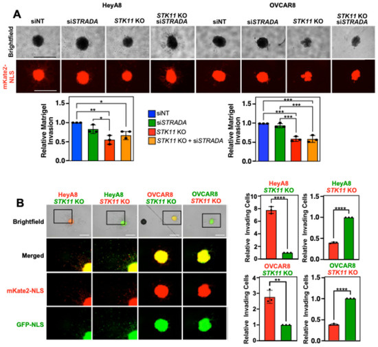 Given that invasion was detected when spheroids were embedded in the highest concentration of Matrigel (50%), we more closely assessed the relative extent of Matrigel invasion by removing the 0–25% Matrigel conditions, performing fewer pairwise analyses, and analysing the corresponding brightfield images. Although the degrees of significance may have changed, the overall conclusions remain that STK11 KO decreased spheroid cell Matrigel invasion in both cell lines while STRADA knockdown showed no clear loss of EOC spheroid cell Matrigel invasion (Figure 4A). Next, we seeded spheroids with both wild-type and STK11 KO cells to assess whether the loss of invasion observed in STK11 KO cells could be rescued by the proteins secreted by wild-type cells or through wild-type-STK11 KO cell interactions. Each cell line expressed nuclear mKate2 (red) and GFP (green). Regardless of which nuclear fluorescent signal was expressed by STK11 KO cells, there were significantly fewer invading cells, even when isogenic cells expressing LKB1 were present within spheroids (Figure 4B). As a result, we provide evidence that LKB1 activity is important for EOC spheroid invasion through a matrix, and co-culturing both wild-type and STK11 KO cells does not salvage the loss of invasion observed in STK11 KO cells.