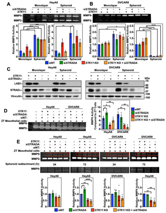Since matrix metalloproteinase 9 (MMP9) and MMP2 are upregulated in ovarian cancer and their activity is correlated with invasion and metastasis [30,31], we hypothesized that the impact of LKB1 and STRADα on EOC invasion is mediated by MMP activity. We utilized zymographic assays to measure MMP2 and MMP9 activity and found increased levels in HeyA8 spheroid cultures compared to monolayer cells. Furthermore, STRADA knockdown decreased MMP9 and MMP2 activity in HeyA8 cell monolayers and spheroid cultures. Alternatively, LKB1 ablation increased MMP activity in HeyA8 monolayer cells, but had no impact on spheroids (Figure 5A). In the OVCAR8 cell line, spheroid culture significantly increased MMP9 activity but decreased MMP2 activity, whereas the downregulation of STK11 or STRADA had no effect on MMP activity (Figure 5B). Cell monolayers and spheroids were lysed and subjected to SDS-PAGE and immunoblotting to verify LKB1 and STRADα downregulation (Figure 5C).