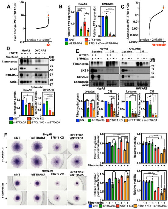 Although LKB1 and STRADα in EOC spheroids regulate MMP9 activity in mesothelial cells, this does not account for our results of LKB1 and STRADα loss in the invasion observed in experiments without ZT cells. Given the importance of ECM components in spheroid formation and invasion [32], we assessed the influence of decreasing LKB1 and STRADα protein levels on ECM components. Using an Affymetrix Human Clariom S microarray on OVCAR8 wild-type and STK11 KO spheroids, we found that fibronectin (FN1) transcript levels were significantly higher in wild-type spheroids than in STK11 KO spheroids (Figure 6A). In support of these results, we observed via RT-qPCR that the downregulation of LKB1 or STRADα reduced FN1 expression in EOC spheroids (Figure 6B). The proteomic analysis of OVCAR8 wild-type and STK11 KO spheroids identified fibronectin as one of the most differentially expressed proteins (Figure 6C). Immunoblotting the cell lysates of HeyA8 and OVCAR8 spheroids verified that LKB1 ablation and STRADα knockdown reduced fibronectin protein abundance (Figure 6D). We next assessed the relative amount of fibronectin secreted by HeyA8 and OVCAR8 spheroid cells and observed that when LKB1 or STRADα were reduced, there was a significant decrease in secreted fibronectin (Figure 6E).