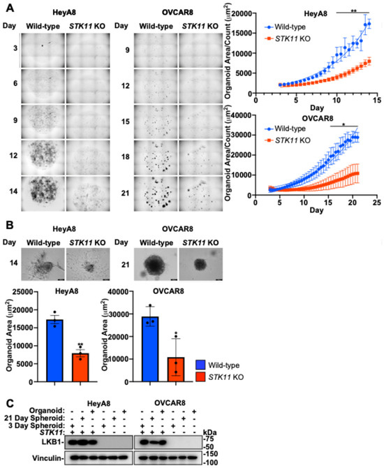 The disruption of the LKB1 pathway through STK11 KO impedes EOC spheroid formation, while downregulating LKB1 or STRADα decreases cell migration, mesothelial clearance, and invasion. We have shown previously in xenografted mice that LKB1 may facilitate the growth and establishment of secondary metastases [26]. To further assess LKB1-STRADα in this final step of advanced EOC pathogenesis, we utilized an in vitro matrix-bound organoid model system to assess metastasis formation. After 14 days (HeyA8) or 21 days (OVCAR8) in culture, LKB1 inactivation decreased the average organoid size, which was exacerbated over time (Figure 7A). Upon termination of the experiment, we assessed the size of individual organoids and verified that LKB1 inactivation decreased the organoid size. As observed in Matrigel-embedded spheroids (Figure 4), STK11 KO reduced cell invasion from these Cultrex-embedded organoids, suggesting that this phenotype is reproducible in different matrices and 3D model systems of EOC (Figure 7B). Following analysis, organoids were lysed and subjected to SDS-PAGE and immunoblotting alongside 3- and 21-day spheroids to verify STK11 KO (Figure 7C). Therefore, LKB1 may be important for the establishment of metastatic niches, as organoid growth and matrix invasion are enhanced by intact LKB1 signalling.