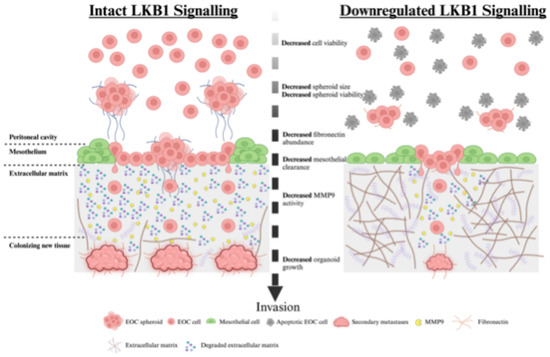 Proposed model of LKB1 pathway activity during ovarian cancer metastasis. EOC cells disseminate from the primary ovarian tumor and form multicellular spheroids in the peritoneal cavity. EOC spheroids colonize distant sites by invading across the mesothelial lining of the peritoneal organs, reorganizing the underlying extracellular matrix, and establishing secondary tumors. Our in vitro models of EOC metastasis indicated that intact LKB1 signalling is important for EOC spheroid formation and viability in suspension, mesothelial clearance after reattachment, extracellular matrix remodeling, and new secondary tumor growth. The ablation of LKB1 expression decreased each of these key metastatic steps, which may be due to reduced viability, fibronectin production, or MMP9 activity.