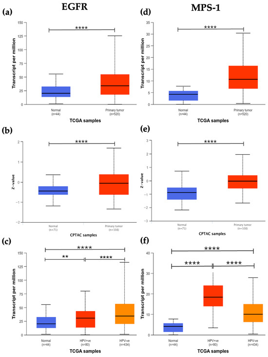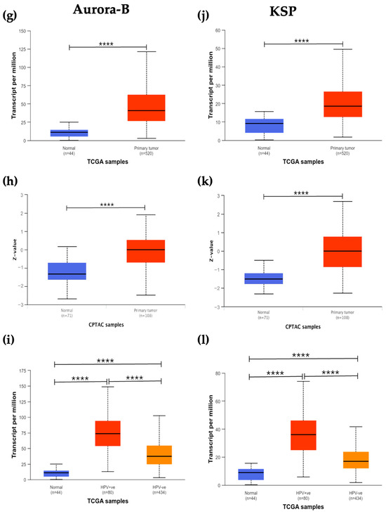 To investigate the expression and assess the potential as biomarkers and treatment targets of EGFR, MPS-1, Aurora-B, and KSP in HNSCC patients, we explored both the UALCAN and GEPIA databases. The analysis revealed that all four proteins are overexpressed at both the mRNA and protein levels compared to normal tissue samples (Figure 1a,b,d,e,g,h,j,k). Furthermore, when examining HPV status, we observed elevated mRNA levels of EGFR, MPS-1, Aurora-B, and KSP in both HPV-negative and HPV-positive samples (Figure 1c,f,i,l). Notably, HPV-positive samples exhibited higher mRNA expression levels for MPS-1, Aurora-B, and KSP, with EGFR showing a less pronounced but still significant increase.