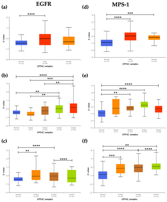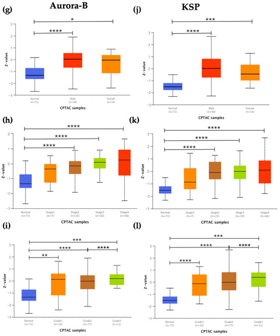 Moreover, overexpression of MPS-1, Aurora-B, and KSP was observed across all tumor stages and grades, except for patients with stage 1 tumors, compared to normal samples (Figure 2e,f,h,i,k,l). In relation to tumor stages, EGFR showed overexpression in stages 3 and 4 compared to normal samples, with statistically significant differences noted between stage 1 and stages 3–4, as well as between stage 2 and stage 4 (Figure 2b). Regarding tumor grades, EGFR was overexpressed in grades 1 and 2, with a statistically significant difference observed between grade 2 and grade 3 (Figure 2c).