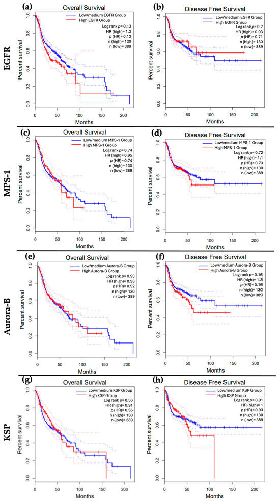 We subsequently explored the impact of overexpression of EGFR, MPS-1, Aurora-B, and KSP on the survivability of patients with HNSCC. Our analysis indicated that high expression levels of EGFR were associated with a trend toward worse overall survival (OS), while the opposite was observed for disease-free survival (DFS) (Figure 3a,b). Furthermore, MPS-1 overexpression appeared to correlate with poorer outcomes for both OS and DFS (Figure 3c,d). Although there was a trend suggesting that patients with high Aurora-B expression had lower DFS, this finding was not statistically significant. Additionally, the OS for patients with low and high Aurora-B expression was similar (Figure 3e,f). Notably, while not statistically significant, patients exhibiting high KSP expression demonstrated a tendency toward worse OS and DFS outcomes (Figure 3g,h).