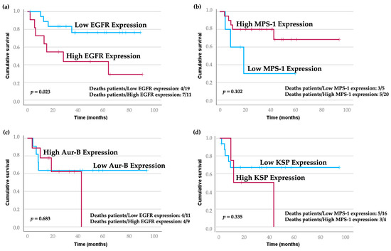 Kaplan–Meier curves illustrating overall patient survival based on expression levels of EGFR (a), MPS-1 (b), Aurora-B (c), and KSP (d). Blue lines correspond to cases with low expression, while red lines represent cases with high expression. Notably, higher EGFR staining intensity is significantly associated with reduced cancer-specific survival. Univariate analysis showed that patients with the highest EGFR expression had shorter survival times compared to those with lower expression levels (p = 0.023).