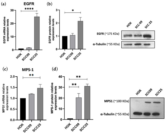 EGFR and MPS-1 are overexpressed in oral cancer cell lines. Relative expression of EGFR (a) and MPS-1 (c) mRNA as determined by qRT-PCR in SCC-09 and SCC-25 tumor cell lines, comparatively to non-tumor HOK. Representative Western Blots showing differential expression at protein levels of EGFR (b) and MPS-1 (d). α-tubulin was used as a loading control. The significance levels were as follows: * p < 0.05, ** p < 0.01 and **** p < 0.0001. Original western blots are presented in File S1.