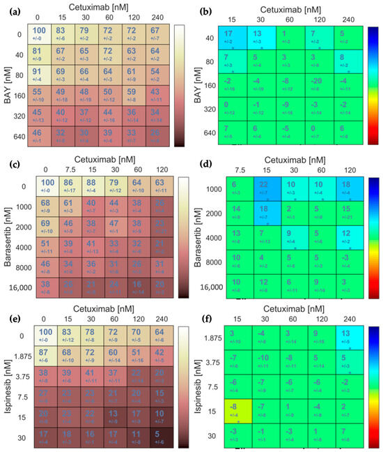 BAY1217389 + Cetuximab (a,b), Barasertib + Cetuximab (c,d), and Ispinesib + Cetuximab (e,f) combinations potentiate cytotoxicity in SCC-25 cell lines. Cell viability (%) after 48 h of exposure to single or combination therapies was determined by MTT assay (a,c,e) based on three independent experiments. Synergy scores (b,d,f) were calculated using the Bliss model in Combenefit software version 2.021, with asterisks denoting synergistic (cyan to blue) or antagonistic (yellow-green to red) effects. The statistical significance levels were the following: * p < 0.05.