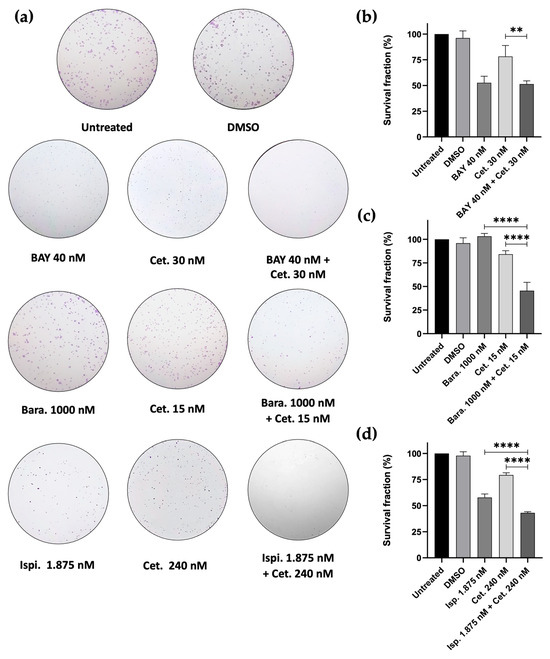 To evaluate whether drug combinations resulted in prolonged anticancer effects, we performed colony formation assays in SCC-25 cancer cells. The cells were exposed to the different combinations for 48 h, after which the medium was replaced with fresh medium. Colonies were counted after 7 days. Our results indicated that the combinations of Barasertib + Cetuximab and Ispinesib + Cetuximab significantly reduced colony formation compared to single treatments. In contrast, the combination of BAY1217389 + Cetuximab resulted in a reduction similar to that of BAY1217389 alone (Figure 8a–d). Specifically, a colony survival fraction of 53.69% ± 2.64 was observed following treatment with Barasertib + Cetuximab, compared to Barasertib (103.24% ± 3.02) and Cetuximab (84.22% ± 3.68) alone. Similarly, the Ispinesib + Cetuximab combination results in a colony survival fraction of 43% ± 1.18, compared to Ispinesib (57.82% ± 3.32) and Cetuximab (79.37% ± 2.12) drugs alone. In contrast, the combinatorial exposure to BAY1217389 + Cetuximab led to a colony survival fraction of 51.37% ± 3.16 compared to 52.64% ± 6.36 for BAY1217389 monotherapy and 78.25% ± 10.63 for Cetuximab monotherapy. These results suggest that the combinatorial approaches, at least for Barasertib + Cetuximab and Ispinesib + Cetuximab combinations, exhibit the ability to maintain long-term cellular cytotoxicity, preventing the proliferation of cancer cells, supporting the therapeutic promise of combining EGFR inhibition with Aurora-B or KSP inhibition, and to a lesser extent with MPS-1 inhibition, in oral cancer treatment. Thus, these combinations appear to be viable strategies to enhance therapeutic outcomes.