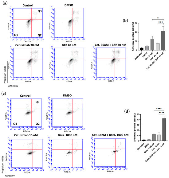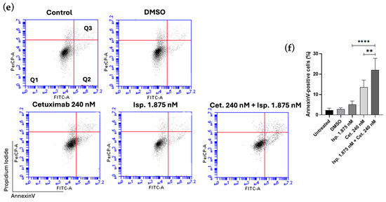 After observing increased cytotoxicity with the combination treatments, we further investigated whether this effect was mediated by Cetuximab promoting apoptosis, using flow cytometry for analysis. Cetuximab alone significantly increased the percentage of apoptotic cells compared to the control. BAY1217389 alone demonstrated a slight increase in apoptotic cells compared to the control (7.48 ± 1.60% vs. 2.3 ± 0.72%, respectively), while Barasertib alone resulted in a similar increase as Cetuximab alone (12.2 ± 2.47% vs. 11.63 ± 3.76%, respectively). For the combination of Cetuximab and Ispinesib, cells were exposed for 24 h to ensure the analysis captured all cells undergoing apoptosis, as this combination resulted in a high number of dead cells at this time, thereby minimizing the risk of loss. However, Ispinesib alone did not exhibit a statistically significant difference compared to the control (5.04 ± 1.77% vs. 2.3 ± 1%).