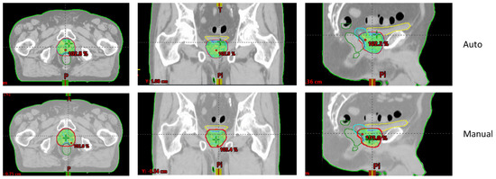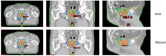 Figure 1 and Figure 2 show an example of dose distributions comparing automated and manual treatment plans for prostate-only localization. Another example for whole-pelvic irradiation is shown in Supplementary Materials Figures S1–S3.