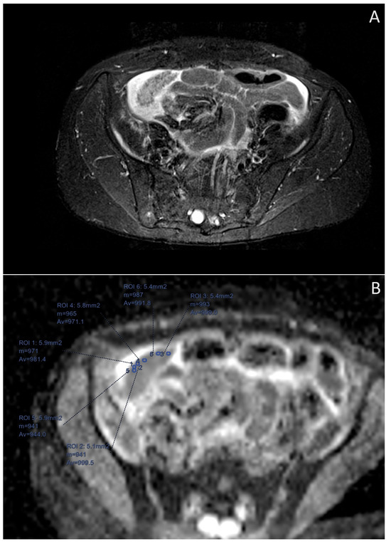 Two radiologists with experience in abdominal and pelvic MRI (one with more than 15 years of experience in oncological imaging and one with a European diploma in radiology) independently analyzed the images. First, the abdomen was divided into the following areas according to the PCI index: the right hypochondrium, epigastrium, left hypochondrium, left flank, left iliac fossa, pelvis, right iliac fossa, central, right flank, proximal jejunum and ileum and distal jejunum and ileum. Each area was analyzed according to the presence of peritoneal metastases and their size, which were further subdivided into groups: small (<1 cm), medium (1–2 cm) and large (>2 cm). Then, the metastasis with the qualitatively highest diffusion restriction was selected to quantitatively measure the ADC values. Small ROIs (5 mm) were placed into the areas with the solid part of the metastasis on the DWI scans, which were acquired with a b value of 1500 mm2/s, and the cystic parts and artifacts were avoided. Then, according to the DWI selection, the ROIs were placed on the ADC maps (Figure 1 and Figure 2). The measurements on the ADC maps were saved. Three measurements were made by each radiologist independently.