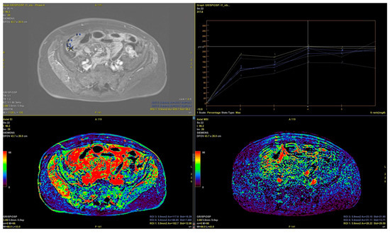For the DCE T1 images, first, precontrast images were acquired, and then each phase was subsequently acquired after contrast was administered. The perfusion maps and charts were produced automatically via AV Server 4.2 software. The areas of metastases were analyzed as described above. For the peritoneal metastases selected for measuring the ADC values, small ROIs were placed on the T1 postcontrast images and recreated on the DCE parametric maps (Figure 3 and Figure 4). Again, three measurements were made by each radiologist independently. Parameters such as the time to peak (TTP) and perfusion maximum enhancement (Perf. Max. En.) were measured, and all the values were saved.