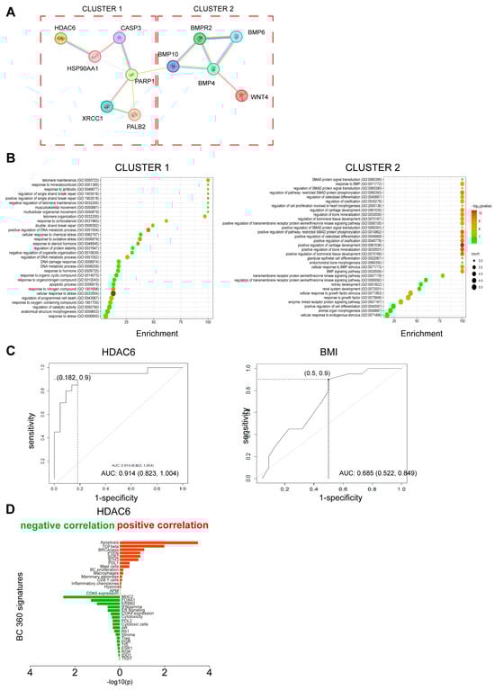 Identification of prognostic markers. (A) Protein–protein interaction (PPI) network of the five medoids based on STRING database. The network nodes are proteins. The edges represent the predicted and known protein–protein associations. Different colored edges represent different associations. Light blue: experimental evidence from the database; purple: experimentally determined; yellow: text mining evidence; indigo: protein homology. (B) Enrichment bubble plot describing the pathways enriched within clusters 1 and 2. Cluster 1 is composed of 6 genes (HDAC6, PALB2, PARP1, XRCC1, CASP3, and HSP90AA1). Cluster 2 is composed of 5 genes (BMP10, BMPR2, BMP4, BMP6, and WNT4). Information on pathway enrichment was retrieved using GO enrichment analysis tools (https://geneontology.org accessed on 6 November 2023). The color scale indicates different thresholds of the p-value, and the size of the dot indicates the number of genes corresponding to each pathway. Bubble plots were obtained using the online free tool SRplot []. (C) ROC curve for prediction of disease relapse based on HDAC6 gene expression and on BMI. Curve from the multivariable logistic model. Sensitivity and 1-specificity values were also reported in correspondence with the cutoff obtained by the Youden index. (D) Diagram showing the correlations between HDAC6 and BC360 signatures. Signatures positively correlated are shown in red, and signatures negatively regulated are shown in green. The asterisks indicate the most significant correlation based on p-value and R score (−0.4 ≥ R score ≥ 0.4).