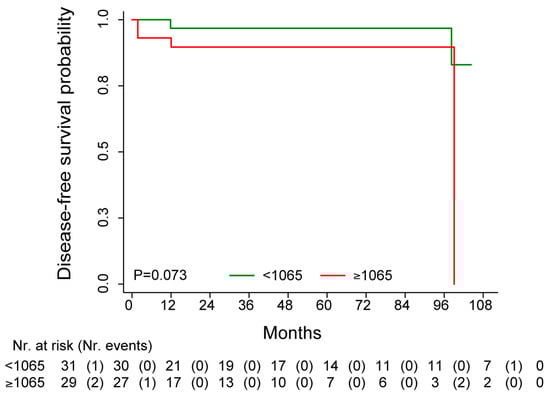 The TCGA data were available for 65 HER2-positive patients treated with adjuvant trastuzumab. However, DFS (7 events total) was available for 60 of the 65 patients. The median DFS was not reached, and the median follow-up time was 40.5 months (95% CI: 32.7–63.3) (Figure 2). Patients’ characteristics are reported in Table S4. The survival analysis, performed according to the median value of HDAC6 expression, showed that patients with higher HDAC6 values were associated with unfavorable DFS as compared to patients with lower HDAC6 levels (HR = 4.52, 95% CI: 0.83–24.58, p-value = 0.081). Adjusting by stage, the dichotomized HDAC6 maintained its association with DFS (HRadj = 5.98, 95% CI: 1.01–35.35, p-value = 0.049). The same trend was also found when considering HDAC6 as a continuous variable (HRadj = 1.96, 95% CI: 0.91–4.22, p-values = 0.087).