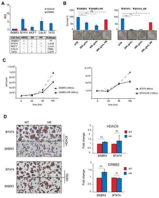We explored the expression of HDAC6 and ERBB2 genes in a panel of BC cell lines. ERBB2 was expressed in the SKBR3 and BT474 cell lines classified as HER2+ and luminal B, respectively [], while HDAC6 expression was detected in all cell lines (Figure 3A). Based on these results, we considered the SKBR3 and BT474 cells to perform in the biological evaluation. Both cell lines were sensitive to trastuzumab, as confirmed by the clonogenic assay. The trastuzumab IC50 values for both cell lines were lower than 150 μg/mL, corresponding to the plasma peak concentration reported by the pharmacokinetic studies. The BT474 cells were the most sensitive, with an IC50 of 38.7 ± 3.06 μg/mL, while the IC50 of SKBR3 was 115.2 ± 14.5 μg/mL (Figure 3B). Then, we established trastuzumab-resistant (HR) subclones of the two above-mentioned HER2+ BC cancer cell lines to investigate the therapeutically exploitable role of HDAC6 by using the specific inhibitor NexturastatA. Starting from a concentration of 10 μg/mL, both cell lines were exposed to gradually increasing concentrations of trastuzumab. The cells were considered resistant when able to grow through lifetime exposure using a trastuzumab concentration higher than that corresponding to the plasma peak. The IC50 of the SKBR3-HR subclone was 446.9 ± 30.90 μg/mL and 767.5 ± 16.06 μg/mL for the BT47 HR subclone. The relative resistance IC50 index (RR IC50) of each subclone was calculated: the cell line expressing the highest HDAC6 level showed the highest RR IC50 (SKBR3-HR 3.87 vs. BT474-HR 19.8). Once the establishment of resistance was confirmed, SKBR3-HR and BT474-HR were kept at a 400 μg/mL maintenance dose. Simultaneously, the wild-type (WT) parental cell lines were grown without treatment to be used as controls. Both HR subclones showed a growth rate decrease as compared to the parental cell line (Figure 3C). Unless non-significant, we observed the ERBB2 and HDAC6 expression trending up in HR subclones (Figure 3D).