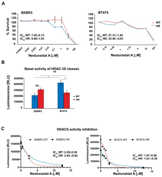 HDAC6 activity in BC cells. (A) NextA cytotoxic activity. BC cells were treated with NextA at concentrations ranging from 0.37 nM to 100 μM for 72 h. n = 3, mean ± SD. Cell viability was measured using MTS CellTiter96® Aqueous One Solution cell proliferation assay. (B) Whole HDAC classes I/II basal activity in both WT and HR BT474 and SKBR3 cell lines, * p < 0.05, ns: not significant; (C) WT and HR cells were treated with Nexturastat A at concentrations ranging between 0.008 μM and 12.5 μM. HDAC class I/II activity was measured using HDAC-GloTM class I/II assay.