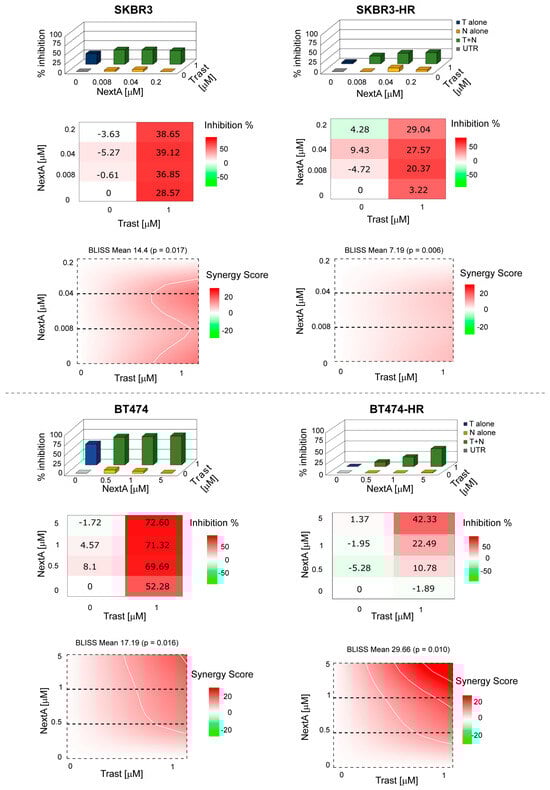 Drug combination evaluation. BC cells were treated with trastuzumab and NextA both alone and in combination. MTS CellTiter96® Aqueous One Solution cell proliferation assay was used to determine cell viability. The BLISS synergy score was evaluated using the SynergyFinder.org web application. Score < −10 antagonism, between −10 and 10 additivity, >10 synergism.