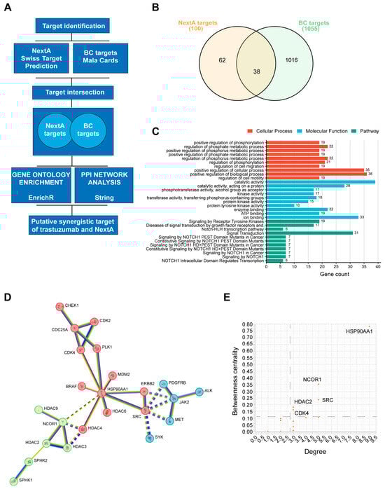 Network pharmacology. (A) Outline of the tools used for the study. (B) Venn diagram represents the intersection of BC-associated genes and NextA targets. (C) Bar plot showing most significant cellular processes, molecular functions, and pathways enriched with NextA and BC-associated common genes. (D) PPI network map of trastuzumab and NextA targets against BC targets. The unsupervised clustering method, k-means clustering, was applied to identify the clusters. (E) Graph showing the most relevant targets of the PPI network identified by degree and betweenness centrality.