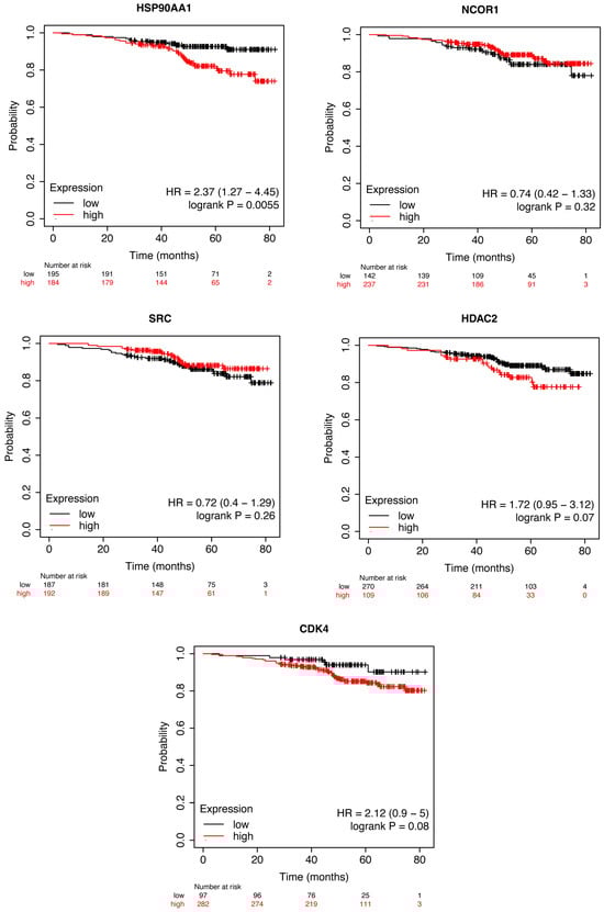 To evaluate if the expressions of HSP90AA1, NCOR, SRC, HDAC2, and CDK4 were associated with overall survival (OS) among HER2+ BC patients, we used the Kaplan–Meier Plotter (https://kmplot.com accessed on 18 January 2024) to perform survival analysis.