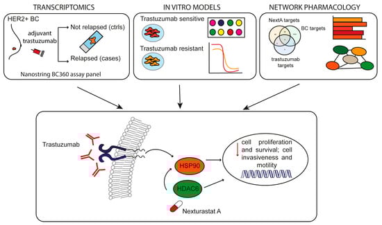 The main aim of the present study was to identify the molecular factors associated with disease relapse of HER2-positive BC patients treated with adjuvant trastuzumab. To reach the study aim, a case-control study was conducted, and on primary tumors, an extensive gene expression profile specifically designed to evaluate the signatures involved in BC aggressiveness and evolution was performed. The secondary aim was to investigate these molecular factors as druggable targets exploitable in BC.