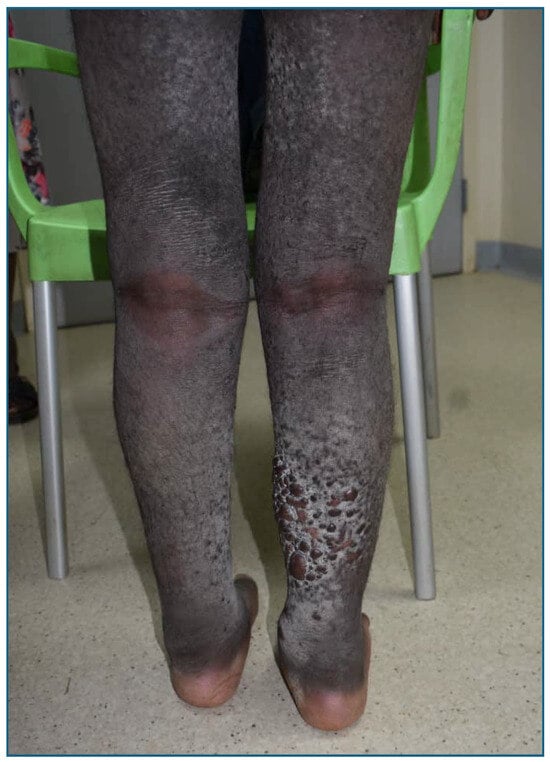 KS tumor-associated edema, often referred to as “woody edema” because of its firm, wood-like cutaneous skin lesions, typically affects the lower extremities and occurs in about a third of KS cases [3,11,12,13]. Clinically, it is identified by hard, non-pitting edematous skin, often accompanied by hyperpigmented, ulcerated, or fungating lesions (Figure 1). These complex lesions consist of tumor cells, dysplastic lymphatic hyperplasia, lymphostasis, and inflammatory infiltrates [14,15]. Though KS edema is distinct from other forms of lymphedema, various terms such as “KS tumor-associated edema”, “woody edema”, and “KS lymphedema” are used to describe these neoplastic lesions [1,14,16].