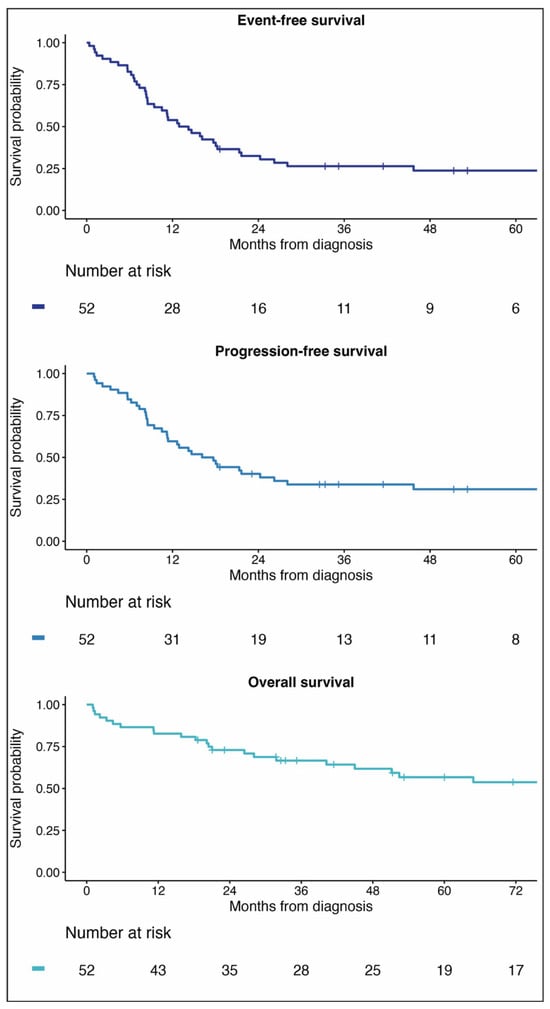 Event-free survival was calculated as the time from diagnosis to (1) failure to achieve documented CR after the initial course of chemotherapy; (2) progressive disease in patients with PR; (3) relapse in patients with CR; or (4) death, whichever is earliest. Progression-free survival was calculated among patients in CR or PR off of chemotherapy between diagnosis and progression, relapse, or death. Overall survival was the time from diagnosis to death. Patients lost to follow-up were censored. Treatment abandonment was not recorded. All surviving patients were right-censored on 31 December 2023.