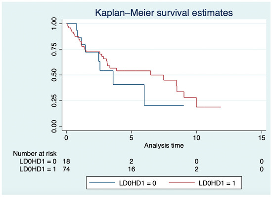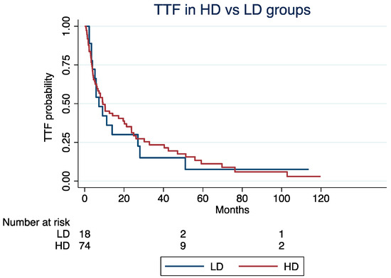 The TTF was not significantly different in the LD vs. HD groups (Hazard Ratio [HR]: 1.24, 95% Confidence Interval [CI]: 0.68–2.25; p = 0.47), even after adjusting for age at the C1D1 of everolimus (HR: 1.02; 95% CI: 1.01–1.04; p = 0.002), NET grade (grade 3 vs. 1/2; HR: 1.27, 95% CI: 0.95–1.71; p = 0.11), or treatment line (third or higher vs. first or second; HR: 1.55, 95% CI: 0.92–2.62; p = 0.09).