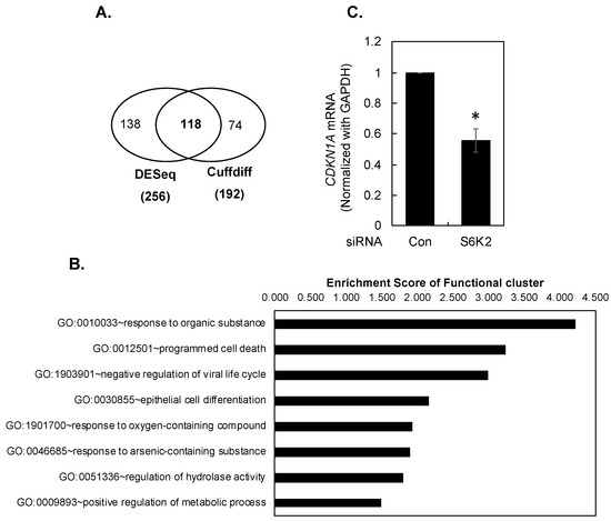 RNA-Seq analysis. (A). Venn graph of DEGs detected using both Cuffdiff and DESeq following S6K2 KD. FDR < 0.05 was applied for each method. (B). The representative gene ontology terms of functional annotation clusters, which are significantly enriched in 118 shared DEGs (FDR < 0.05). (C). Densitometric quantification of CDKN1A mRNA normalized with GAPDH control. The asterisk (*) indicates a significant difference from control siRNA-transfected cells (p < 0.05) using paired Student’s t-test.