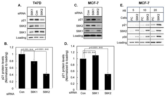 T47D (A,B) or MCF-7 (C,D) cells were transfected with or without control non-targeting siRNA or SMARTpool (SP) S6K1 or S6K2 siRNA. Western blot analyses were performed with indicated antibodies. The intensity of p21 was determined using ImageJ and normalized with respect to loading control. Each bar represents mean ± S.E. p values were calculated using a paired Student’s t test. (E). Different concentrations of cell lysates from MCF-7 cells transfected with an empty vector pcDNA3 (PC) or a vector containing S6K2 construct were subjected to Western blot analyses with indicated antibodies.