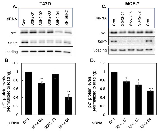 Ribosomal S6 kinase 2 or S6K2, the gene product of RPS6KB2, is considered a neglected kinase since most of the earlier studies focused on its homolog p70S6K or S6K1 as the downstream target of mTORC1 [22]. S6K2 was originally discovered as a kinase that phosphorylates ribosomal protein S6 and shares functional similarity with its closely related homolog S6K1 [3,4,5]. Recent studies, however, suggest that these two homologs may exhibit distinct or even opposite functions [6], and interests in S6K2 are escalating. Since there is a paucity of information regarding the cellular targets of S6K2, we took an unbiased transcriptome profiling to identify potential downstream effectors of S6K2 and made a novel observation that silencing of S6K2 attenuated the expression of the cell cycle inhibitor p21 (CDKN1A). We validated our RNA-Seq data using both RT-qPCR and Western blot. Although p21 is a well-known target of p53, our study suggests that S6K2 also regulates p21 via the p53-independent pathway since the silencing of S6K2 decreased p21 expression in not only MCF-7 cells that contain wild-type p53 but also in T47D cells that contain mutant p53.