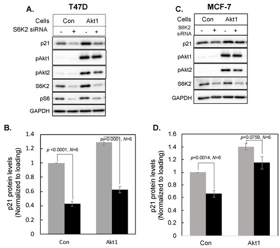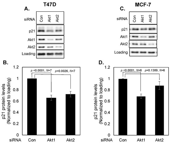We have previously shown that S6K2 acts upstream of the Akt signaling pathway in MCF-7 cells [19]. We therefore examined if S6K2 regulates p21 via Akt. We also compared the effects of Akt1 versus Akt2 siRNA on p21 levels. Figure 4 shows that knockdown of Akt1 caused a more than 30% decrease in p21 levels in both MCF-7 and T47D cells. While knockdown of Akt2 also decreased p21 in T47D cells albeit less efficiently than Akt1 knockdown (Figure 4A,B), Akt2 knockdown had little effect in MCF-7 cells (Figure 4C,D).