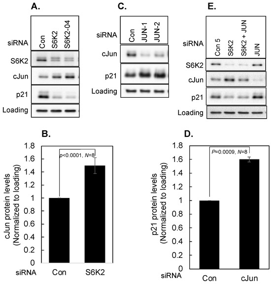 We have previously shown that S6K2 regulates apoptosis via c-Jun N-terminal kinase (JNK) independent of the Akt signaling pathway in T47D breast cancer cells [20]. Based on our RNA-Seq data, knockdown of S6K2 enhanced JUN mRNA by 2-fold (Supplementary Table S1). It was one of the most shared DEGs among the enriched functional clusters, including programmed cell death (Figure 1B and Supplementary Table S2). Western blot analysis revealed that a decrease in p21 by S6K2 knockdown was associated with an increase in cJun protein (Figure 6A,B). To determine if an increase in cJun by S6K2 knockdown was responsible for the decrease in p21, we compared the effects on two different cJun siRNAs on p21 levels. Figure 6B shows that both siRNAs increased p21 levels (Figure 6C,D) and the silencing of S6K2 attenuated the increase in p21 caused by cJun knockdown (Figure 6E). These results suggest that S6K2 negatively regulates cJun, and an increase in cJun by S6K2 knockdown is responsible for the downregulation of p21 in T47D cells.