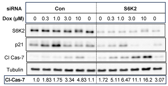 To determine if a decrease in p21 by S6K2 knockdown was associated with increased sensitivity to an apoptotic stimulus [19,20], we treated T47D cells with different concentrations of the chemotherapeutic drug doxorubicin. Figure 7 shows that treatment of T47D cells with low concentrations of doxorubicin induced p21 up to 1 µM doxorubicin followed by a decrease in p21. During apoptosis, procaspases are cleaved to generate active caspases, and the activation of effector caspases ultimately cleaves critical cellular proteins, such as poly-ADP ribose polymerase (PARP). As shown in Figure 7, low concentrations of doxorubicin had little effect on the processing of effector caspase-7 in control siRNA transfected cell. The generation of cleaved caspase (Cl cas)-7 increased at concentrations of doxorubicin that also caused downregulation of p21. S6K2 knockdown decreased both basal and doxorubicin-induced p21 and enhanced processing of procaspase-7. These results suggest that knockdown of S6K2 enhanced cellular sensitivity to doxorubicin by lowering p21 levels.