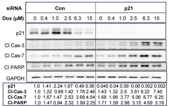 We then examined if silencing of p21 enhances chemosensitivity. As shown in Figure 8, knockdown of p21 enhanced processing of caspase-3, caspase-7, and PARP. The generation of cleaved fragments of effector caspases appeared at 1 µM doxorubicin and increased with higher doxorubicin concentrations. These results suggest the depletion of p21 enhanced cellular sensitivity to doxorubicin.