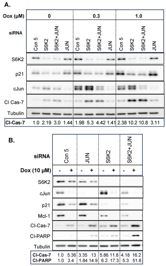 Since S6K2 knockdown decreased p21, whereas cJun knockdown enhanced p21 level, we examined if knockdown of cJun inhibits the S6K2 knockdown-induced increase in apoptotic markers. Figure 9A shows that 0.3 µM doxorubicin increased cJun and knockdown of S6K2 further increased cJun and decreased p21 levels. Subsequent treatment with doxorubicin gradually decreased cJun level such that it was undetectable at 10 µM doxorubicin (Figure 9B). While cJun knockdown had little effect on the cleavage of procaspase-7 at low concentrations of doxorubicin (Figure 9A), it enhanced cleaved caspase-7 at 10 µM doxorubicin (Figure 9B). The combined knockdown of S6K2 and cJun had little or no effect on cleaved caspase-7 at low concentrations of doxorubicin (Figure 9A) but appears to enhance the cleavage of procaspase-7 and PARP at 10 µM doxorubicin (Figure 9B). Thus, cJun knockdown had differential effects on doxorubicin sensitivity depending on the concentrations of doxorubicin.