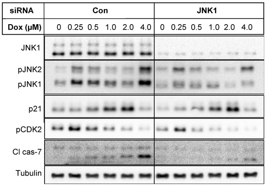 T47D cells were transfected with control non-targeting siRNA or JNK1 siRNA and then treated with indicated concentrations of doxorubicin. Western blot analyses were performed with indicated antibodies.