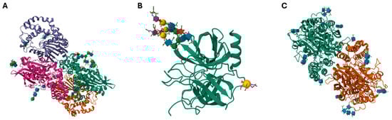 Presentation of three well-known PCa biomarkers, namely extracellular (A) PAP (pdb code 1CVI, EC 3.1.3.2, 167.2 kDa) and (B) fPSA (pdb code 3QUM, EC 3.4.21.77, 30–34 kDa) proteins and membrane-bound (C) PSMA (pdb code 1Z8L, EC: 3.4.17.21, 324.15 kDa). Source: https://www.rcsb.org/ (Protein Data Bank, accessed on 1 September 2024). Glycans attached to protein backbone, recognizable by lectins, are clearly visible.