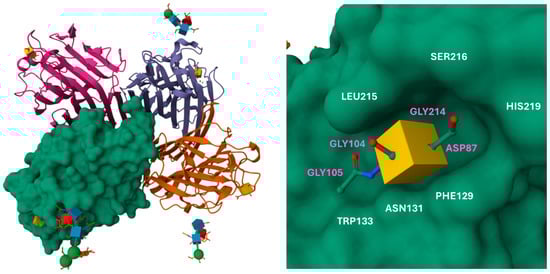 (Left) presentation of Wisteria floribunda lectin (glycoprotein, pdb code 5KXB) and its tetrameric structure with one monomeric chain highlighted as a molecular surface (green). (Right) details of GalNAc-binding site with depicted amino acid residues involved in the saccharide binding (pink residues are involved in the binding directly in the cavity, beneath the GalNAc structure). Source: https://www.rcsb.org/ (Protein Data Bank, accessed on 1 September 2024). The structure also binds Ca2+ and Mn2+ metal ions.