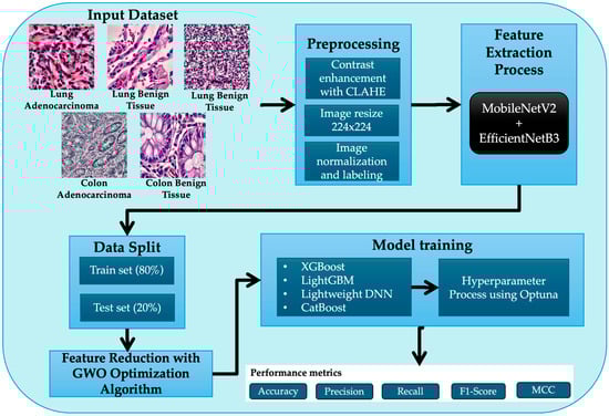 In this manuscript, we present a novel technique for the detection of colon and lung cancer, termed the MEGWO-LCCHC method. The primary objective is to effectively identify colon and lung cancer in both malignant and benign tissues, leveraging a robust feature extraction and classification model. To achieve this, our approach follows a series of subprocesses, which include contrast enhancement of histopathological images using CLAHE, a hybrid feature extraction model based on MobileNetV2 and EfficientNetB3, feature reduction utilizing the GWO, and classification through gradient boosting models (XGBoost, LightGBM, and CatBoost). Additionally, we employ a lightweight DNN for comparative analysis, supported by Optuna-based hyperparameter optimization and cross-validation. Figure 1 illustrates the overall workflow of the proposed MEGWO-LCCHC model and its classification process.