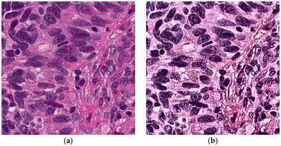 CLAHE was applied to enhance the contrast of histopathological images. This method improves local contrast and adapts to the intensity distribution in different regions of the image, making it particularly suitable for medical imaging tasks where details such as tissue structures are crucial [37]. CLAHE works by dividing the input image into non-overlapping contextual regions and applying histogram equalization within each region. This prevents over-amplification of noise in homogeneous regions of the image.