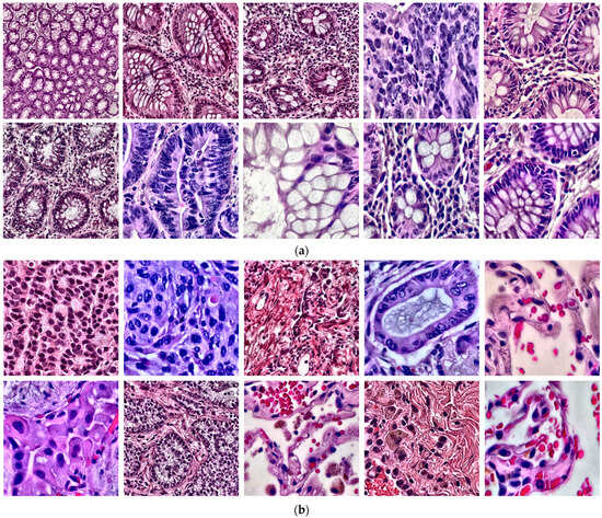 Sample histopathological images of cancer tissues: (a) Enhanced images of colon adenocarcinoma and colon benign tissue using CLAHE; (b) Enhanced images of lung adenocarcinoma, lung squamous cell carcinoma, and benign lung tissue using CLAHE.