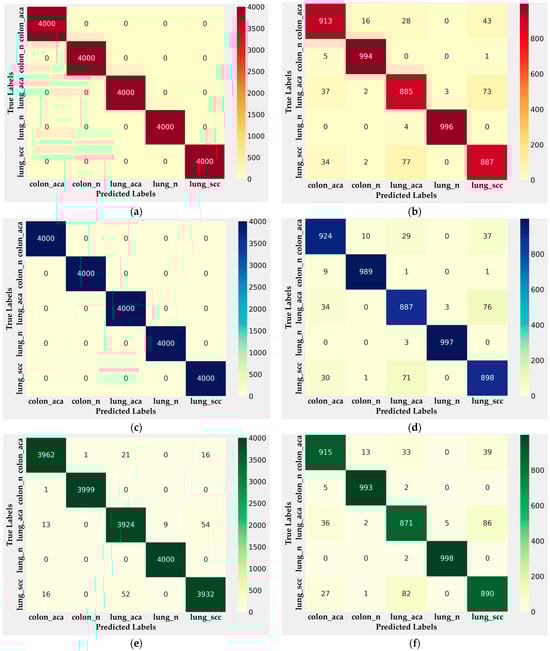 In benign tissue classes, such as colon_n and lung_n, all models exhibited high precision, recall, and F1-scores across both training and testing phases. This strong performance can be attributed to the dataset’s balance in these categories, as no additional images from the National Cancer Institute’s GDC Data Portal were introduced, thereby minimizing variability in these classes.