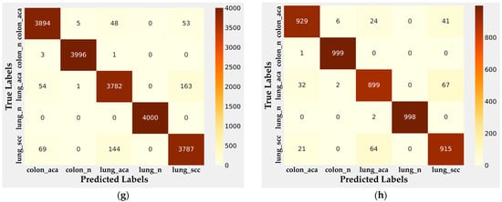 In contrast, the CatBoost classifier’s performance, as seen in Figure 4e,f, shows a high degree of accuracy across both phases, with the model maintaining robust classification performance. The model’s high true positive rates across all classes, particularly in the lung benign and colon adenocarcinoma categories, reflect its ability to generalize well to new data. Similarly, the Lightweight DNN classifier demonstrated strong performance in Figure 4g,h, maintaining a lower rate of misclassification, particularly in the lung cancer categories, while showcasing relatively high precision and recall values.