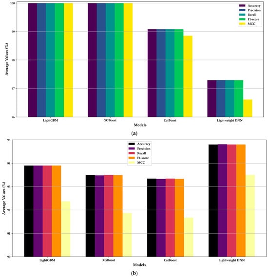 Table 3 and Figure 5a highlight the average evaluation metrics for the MEGWO-LCCHC method during the training phase. Both LightGBM and XGBoost achieved perfect scores (100%) across all metrics, including accuracy, precision, recall, F1-score and Matthews Correlation Coefficient (MCC). While such performance is impressive, it raises concerns about potential overfitting, suggesting that these models may have learned specific nuances and noise from the training data rather than focusing on general patterns. CatBoost, on the other hand, achieved a near-perfect accuracy of 99.09%, with balanced metrics across precision, recall, and F1-score, indicating a more cautious learning approach that mitigates overfitting risks. The Lightweight DNN model also demonstrated strong performance with an accuracy of 97.29%, effectively balancing computational efficiency and predictive power.