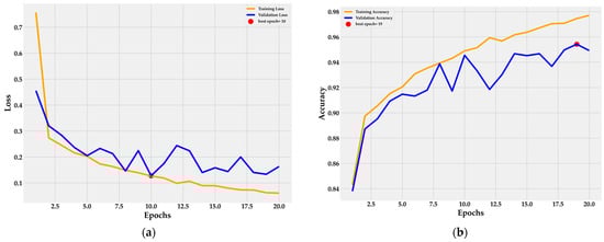 The training and validation loss curves in Figure 7a demonstrate the model’s convergence after 20 epochs, with early stopping identifying the optimal epoch at 10, effectively preventing overfitting. The continuous decline in training loss indicates strong learning from the training data, while the stabilization of validation loss beyond epoch 10 reflects the model’s ability to generalize well to unseen data.
