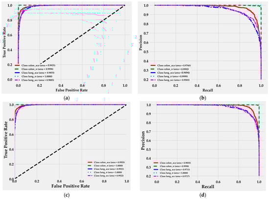 For the Lightweight DNN model, the ROC curves in the testing phase (Figure 8c) exhibit consistently strong performance across all tissue classes, with AUC values above 99%. Malignant lung tissues (lung_aca and lung_scc) perform well, achieving AUC values of 0.9921 and 0.9922, while benign tissues maintain near-perfect performance. The PR curves (Figure 8d) reflect similar trends, with the colon_aca class reaching an AUC of 98.55%, and malignant lung tissues achieving AUC values around 97%.
