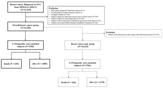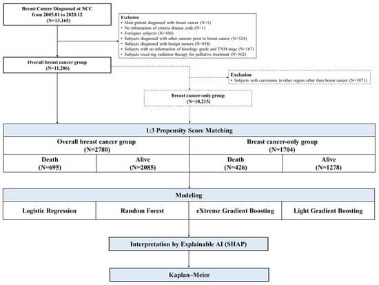 This retrospective study analyzed data from patients diagnosed with breast cancer between January 2005 and December 2020, sourced from the National Cancer Center (NCC), Korea database, a prospectively collected archive of breast cancer treatments at the NCC [32]. Mortality data, including causes of death until 2021, were obtained from Statistics Korea and linked to the NCC database to identify survival status. Initially, 13,165 patients were screened for eligibility, as shown in Figure 2. Given that our study focused on female patients diagnosed with breast cancer, we excluded 1879 patients based on the following criteria: male patients (N = 1), patients without a breast cancer disease code (N = 1), foreign patients (N = 166), patients diagnosed with other cancers before breast cancer (N = 324), patients with benign tumors (N = 858), patients with missing information on histologic grade and TNM stage (N = 167), and patients receiving radiation therapy for palliative treatment (N = 362). After these exclusions, 11,286 patients with a first diagnosis of breast cancer remained, with 695 deaths (6%) and 10,591 survivors (94%). We analyzed the data and found that the occurrence of cancer in other organs after breast cancer diagnosis had the greatest impact on predicting breast cancer mortality. Accordingly, this study was divided into two groups to understand the effect of other variables on mortality prediction. One group included all patients with breast cancer, while the other excluded patients who developed other cancers after a breast cancer diagnosis (n = 1071), leaving a total of 10,215 patients. Among them, 426 (4%) died and 9789 (96%) survived. These were calculated using covariates such as age at diagnosis, height, alcohol consumption, p53(%), Ki-67(%), and human epidermal growth factor receptor 2 (HER2).